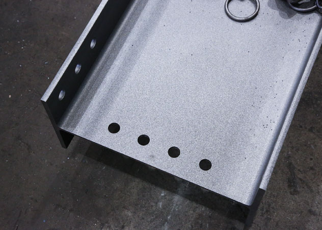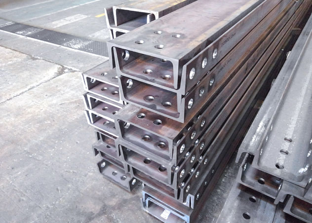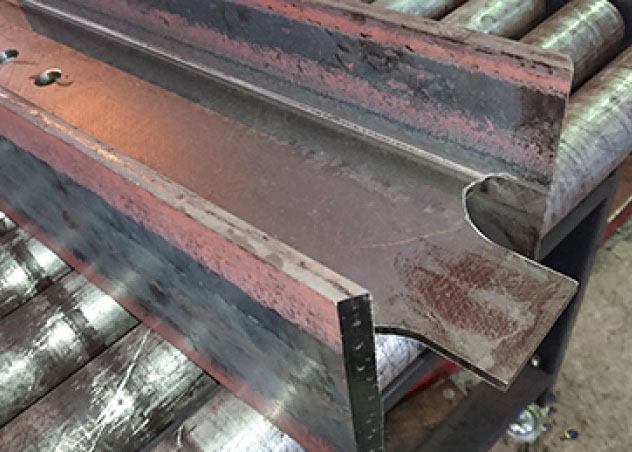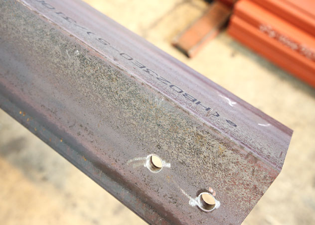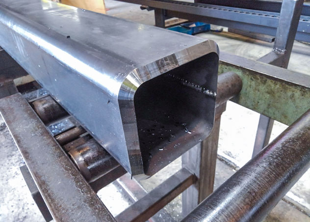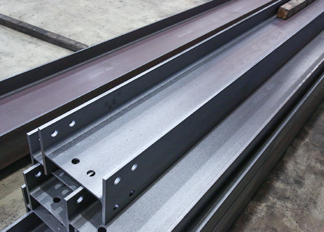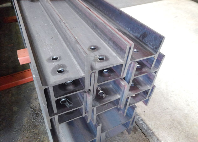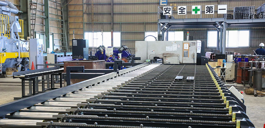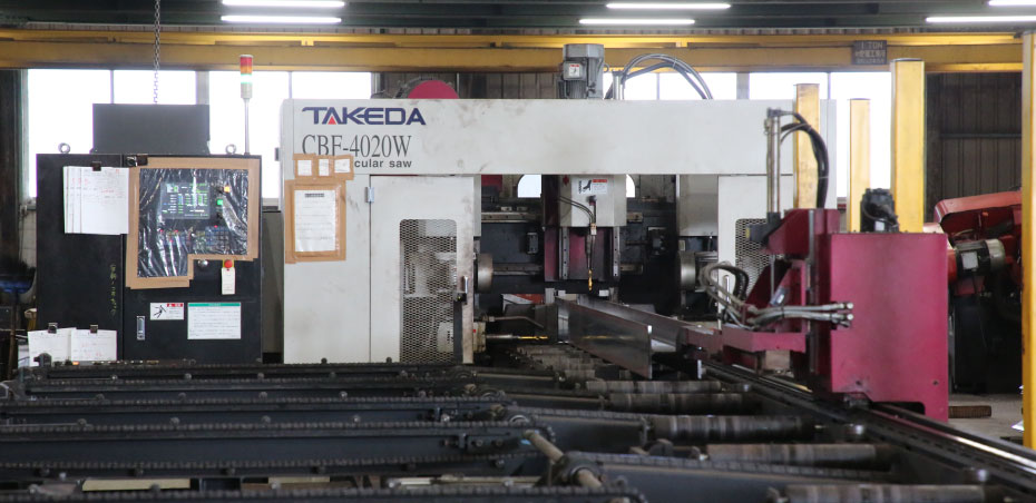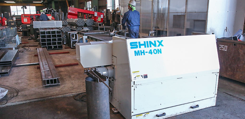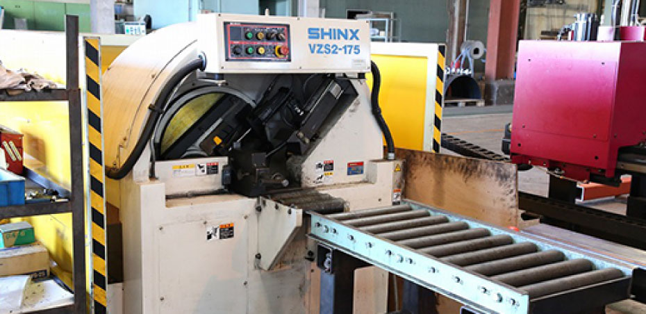 - 長尺形鋼材(6mまで)に特化し、切削加工(フライス削り、穴あけ、ねじ切り)をするマシニングセンタ。エアーバイスで長尺材を固定できるため、材料をずらしたりする必要が無く、16種類の工具を自動で交換することで、高精度・高速加工が可能。